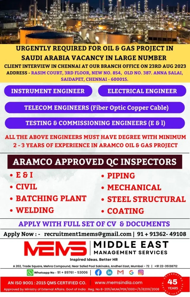 | QC Inspectors : E & I/Civil/Batching Plant/Welding/Piping/Mechanical/Steel Structural/Coating (Aramco Approved) |
