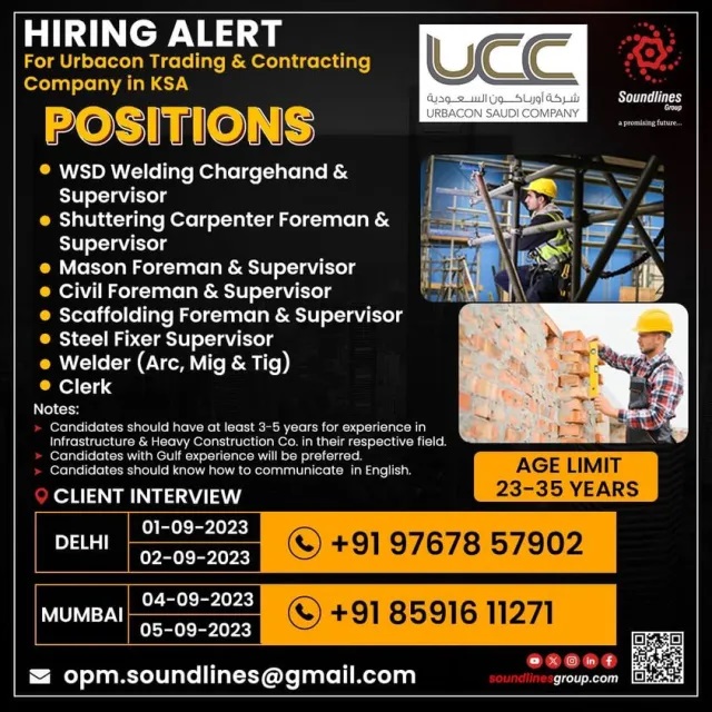 Candidates should have at least 3 to 5 years for experience in Infrastructure & Heavy Construction Company, in their respective field. Candidates with Gulf experience will be preferred. Candidates should know how to communicate in English. Age limit 23 to 35 years