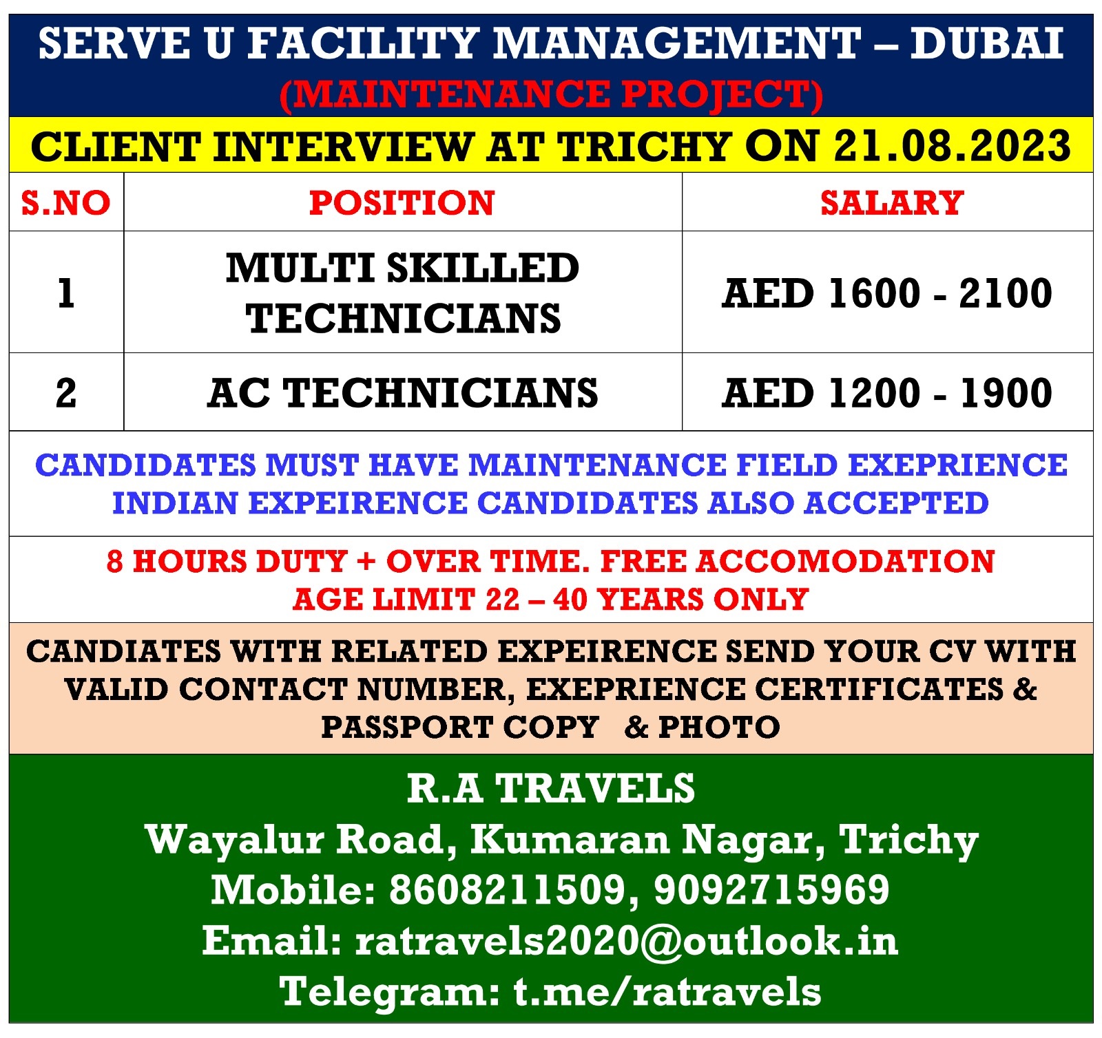 Candidates must have Maintenance field experience, Indian experience Candidates also accepted. 08 hours duty + OT, Age Limit 22 to 40 years Only