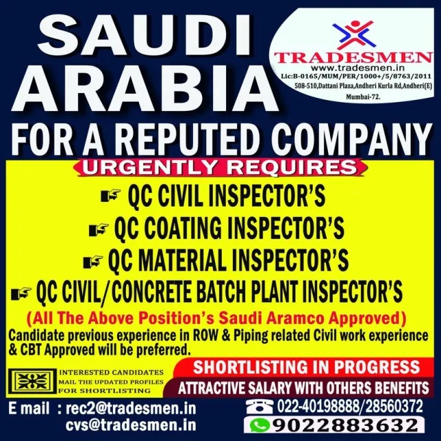 QC Inspector Jobs in Saudi Arabia - Urgently required