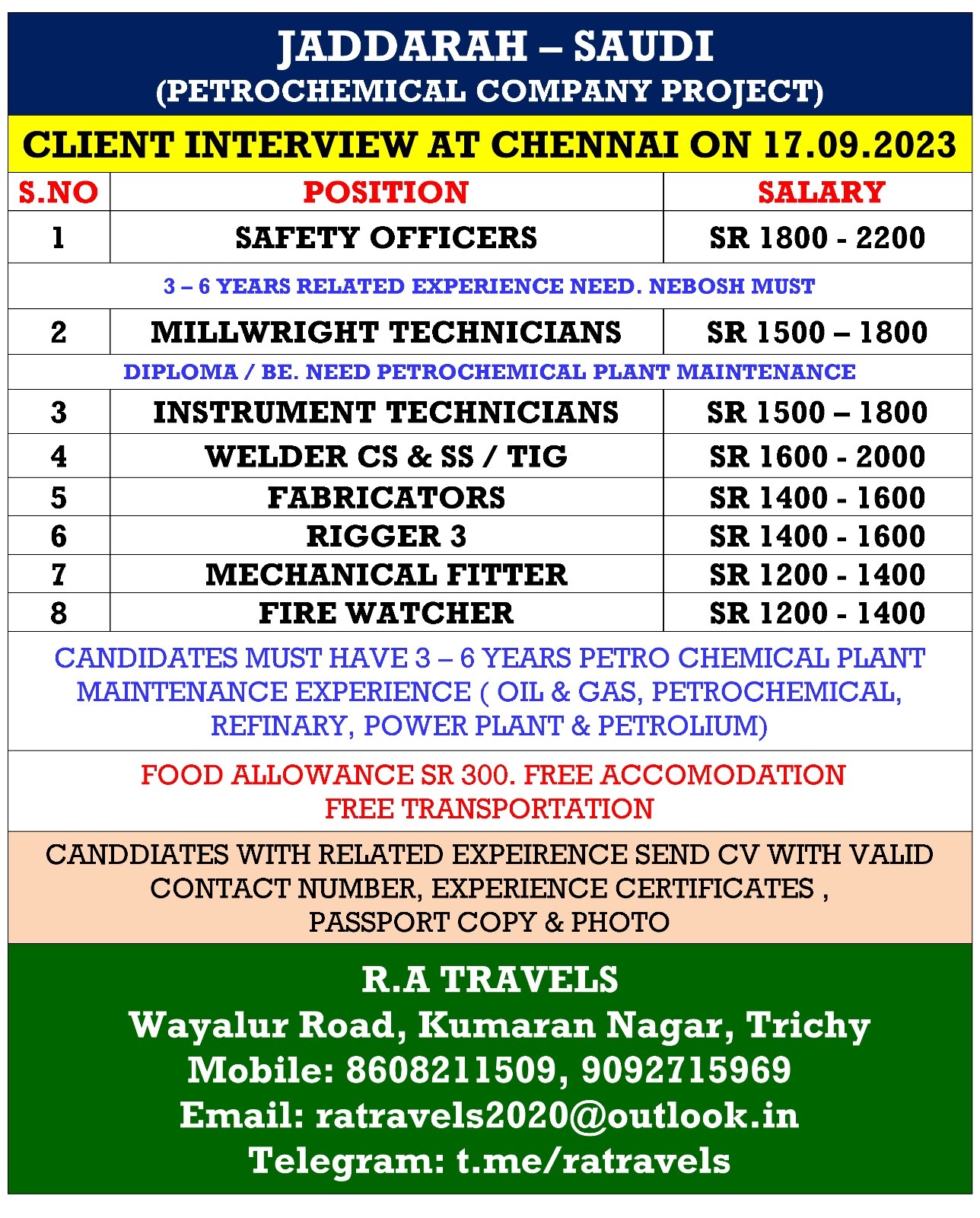 Food Allowance SAR 300/- + Free Accommodation + Transportation