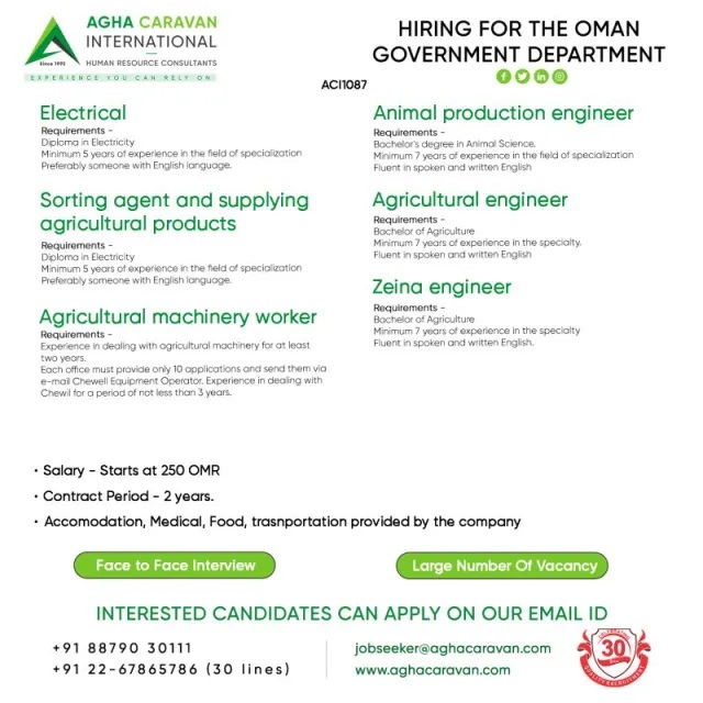 Salary Starts at 250 OMR, + Accommodation + Medical + Food + Transportation Provided by the Company