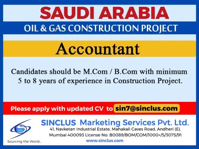 Accountant jobs in Saudi Arabia for Indian - Oil & Gas Project