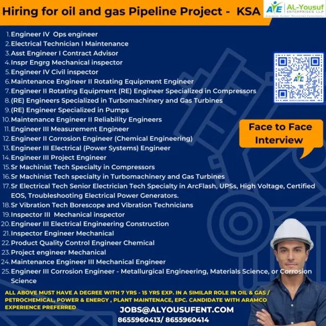 All above must have a Degree with 7 years to 15 years experience in a similar Role in Oil & Gas, Petrochemical, Power & Energy, Plant Maintenance, EPC. Candidate with Aramco Experience preferred.