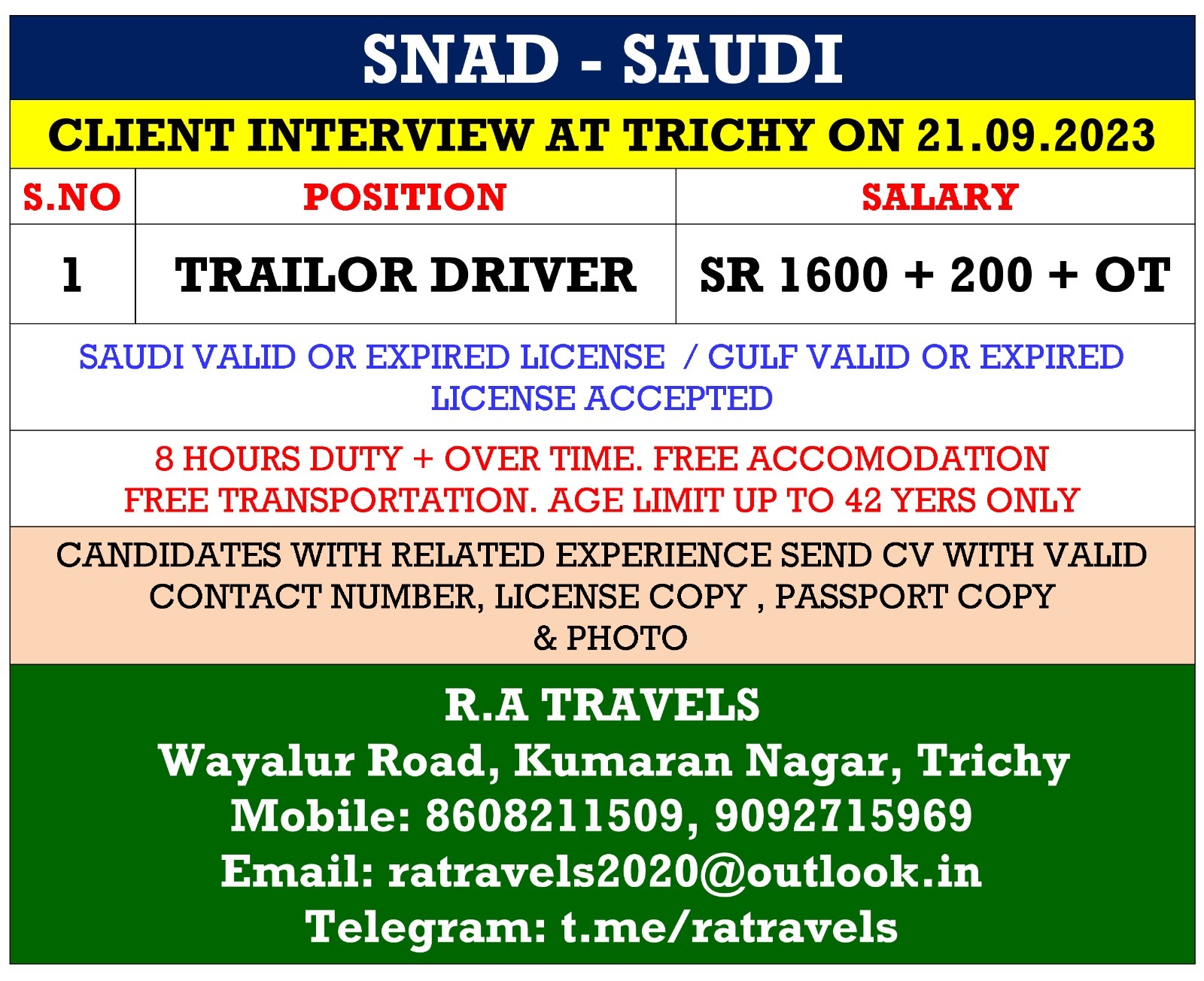 Saudi Valid or Expired License / Gulf Valid or Expired License Accepted. 08 hours duty + Overtime. Age Limit 42 years only