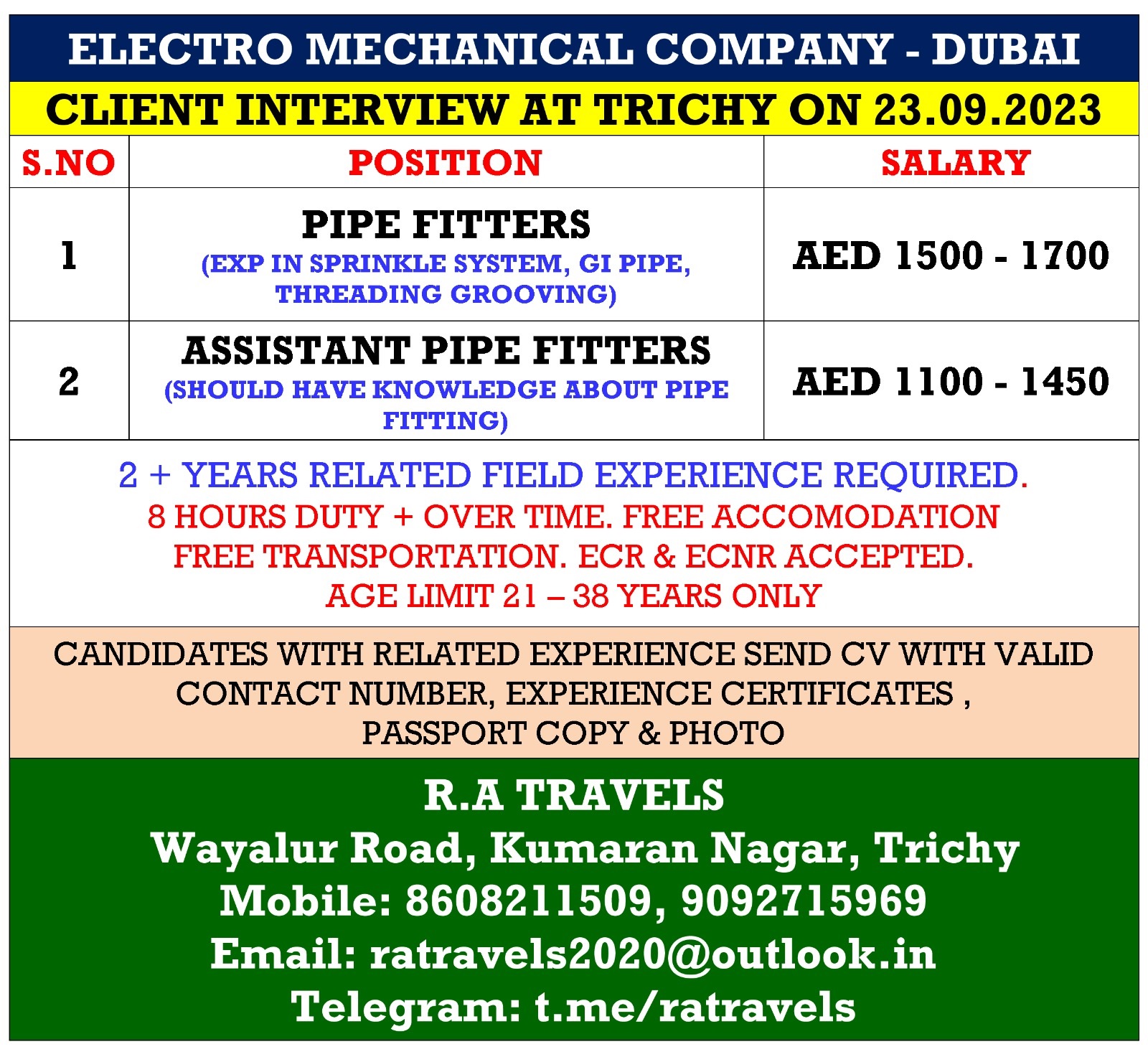 | Assistant Pipe Fitters | 1450 AED |