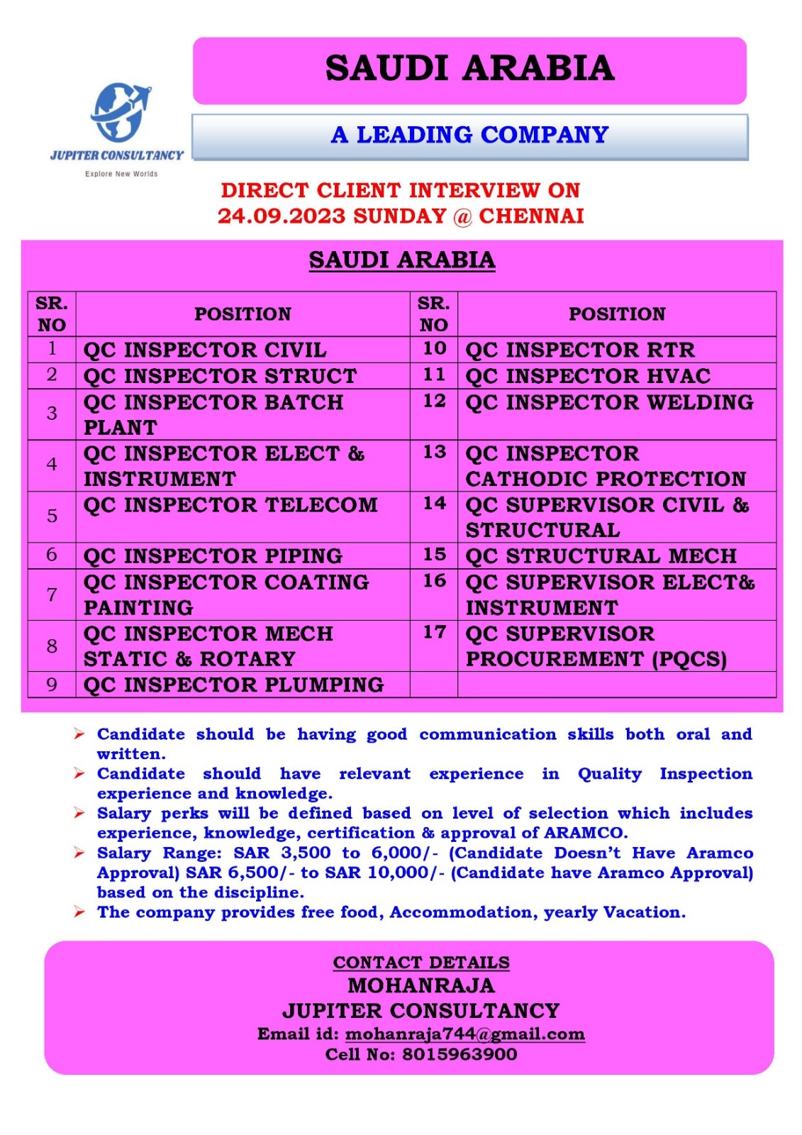 Salary Range : SAR 3500 to 6000/- (Candidates doesn't have Aramco Approval). SAR 6500/- to SAR 10,000/- (Candidate have Aramco Approval) base on the discipline.