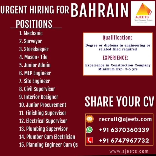 Bahrain job vacancies for Indian - Construction company