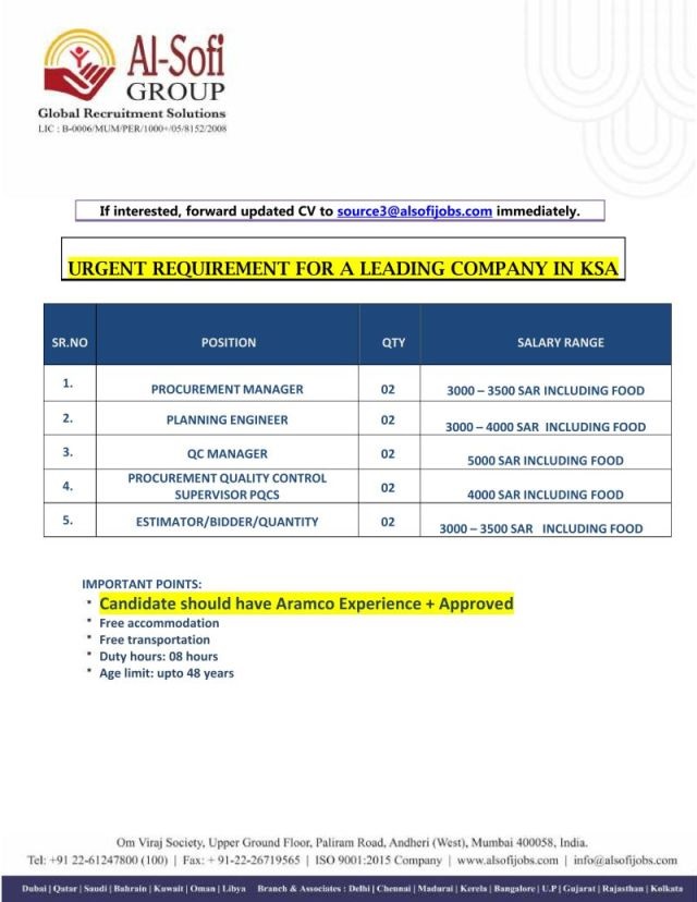 Email : source3@alsofijobs.com / Contacts : 022-61247800