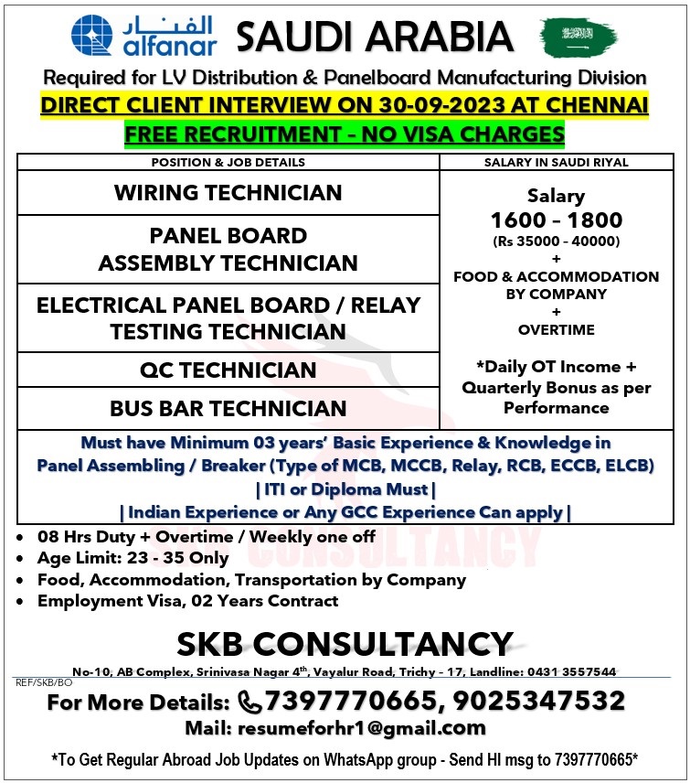 Must have Minimum 03 years Basic Experience & Knowledge in Panel Assembling / Breaker. ITI / Diploma must. Indian experience or Any GCC experience can apply. 08 hours duty + Ovetime, Age Limit 23 to 35 Only.