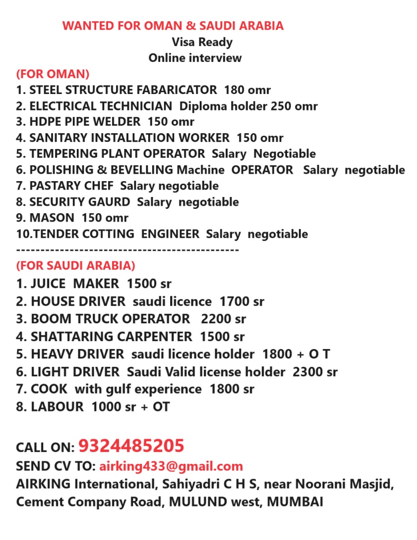 Disclaimer:- GCCWALKINS have no involvement in any recruitment process, This website just sharing job vacancies & interviews from various sources. Applicants are advised to research the bonafides of the prospective employer independently. We do NOT endorse any requests for money payments and strictly advice against sharing personal or bank related information. If you suspect any fraud or malpractice, email us at gccwalkins@gmail.com