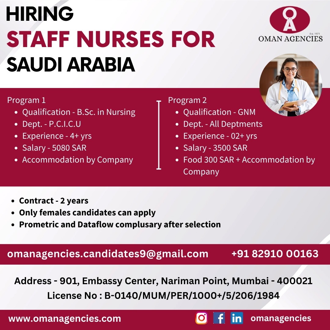 Staff Nurse Vacancy in Saudi Arabia - Urgent hiring