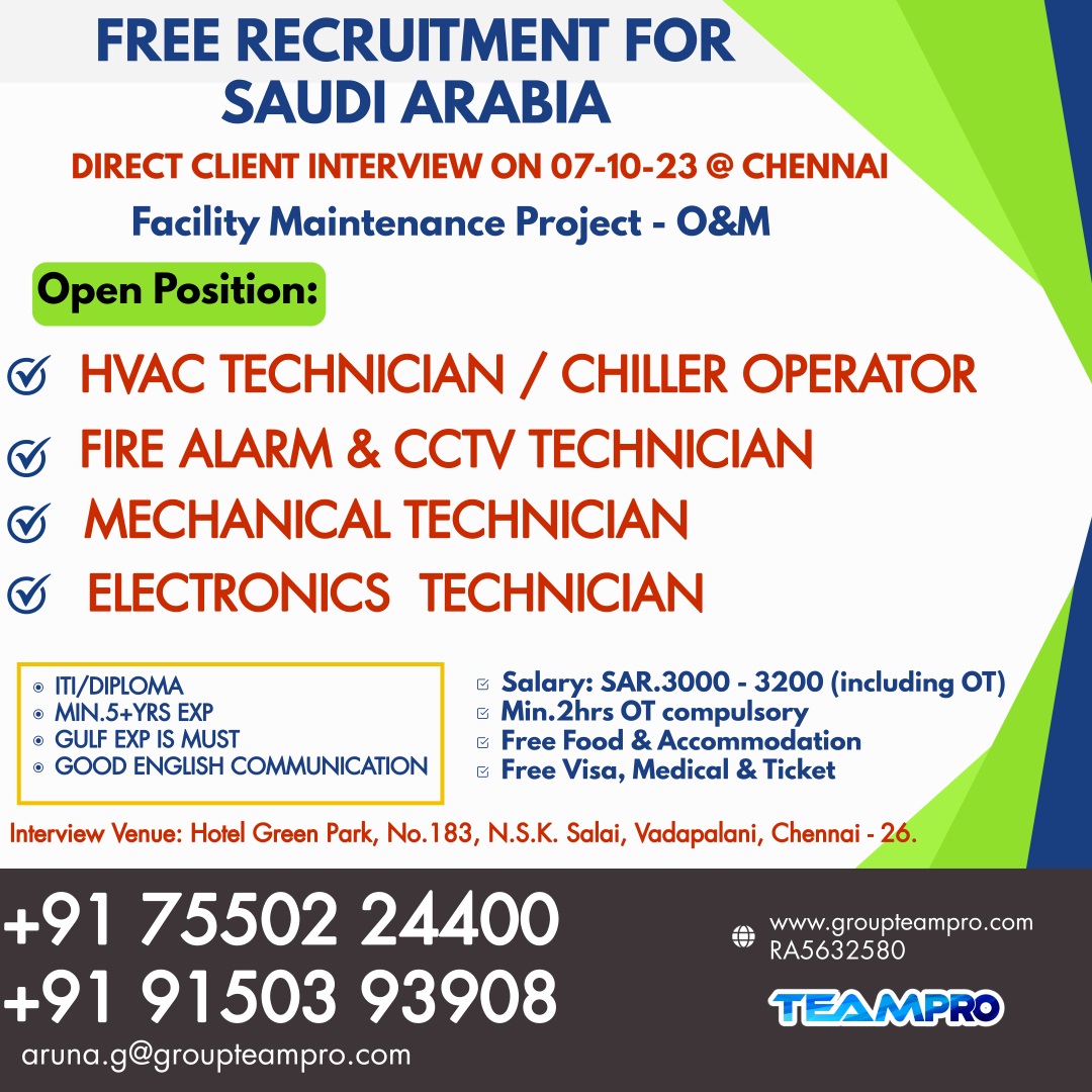 Salary : SAR 3000 to SAR 3200 (Including OT) + Free Food + Accommodation + Free Visa + Medical + Ticket