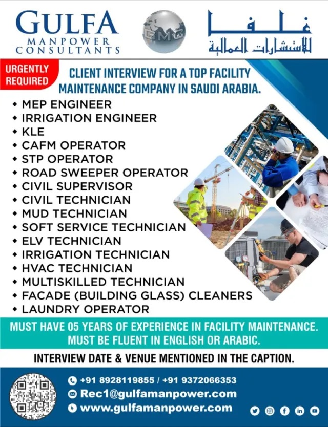 Must have 05 years of experience in Facility Maintenance. Must be fluent in English or Arabic