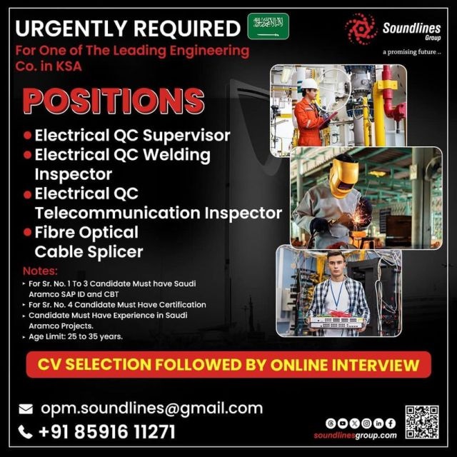Candidates must have experience in Saudi Aramco Projects. Age Limit 25 to 35 years.