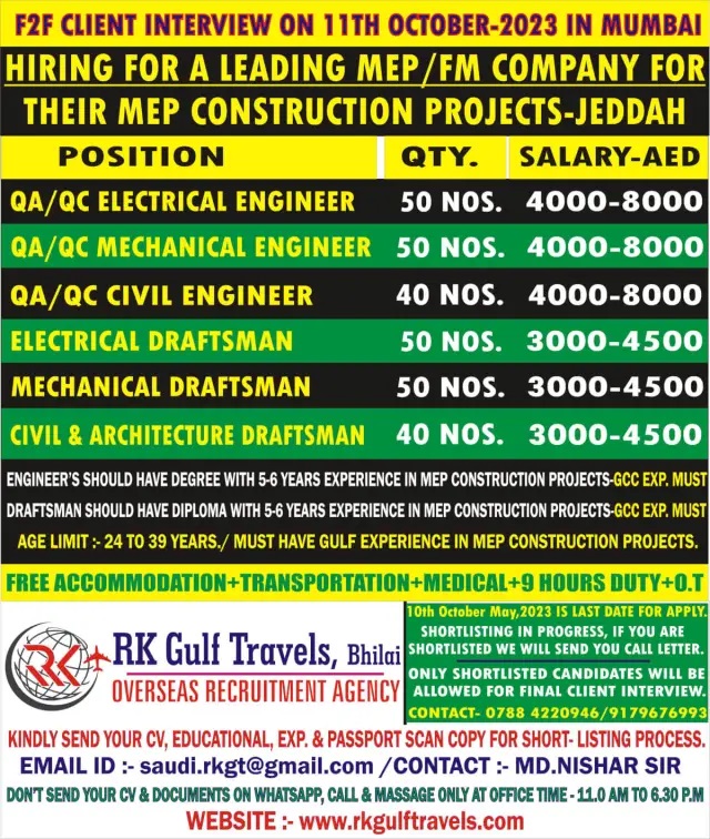 Engineer's should have Degree with 5-6 years experience in MEP Construction Project - GCC exp. must. Draftsman should have Diploma with 5-6 years experience in MEP Construction Project - GCC exp. must. Age Limit 24 to 39 years.