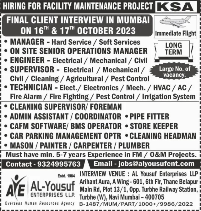 Email : jobs@alyousufent.com / Contacts : 9324995763