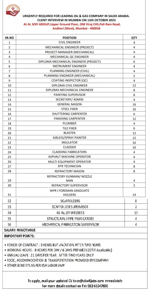 Walk-in-interview on 13th October 2023 at Mumbai : Al Sofi Group, Upper Ground Floor, OM Viraj CHS, Pali Ram Road, Andheri (West), Mumbai - 400058