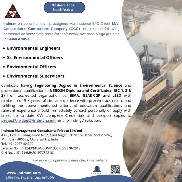Candidates having Engineering Degree in Environmental Sciencen and professional qualification in NEBOSH Diploma and Certificate. Minimum 5+ years of similar experience with proven track record.