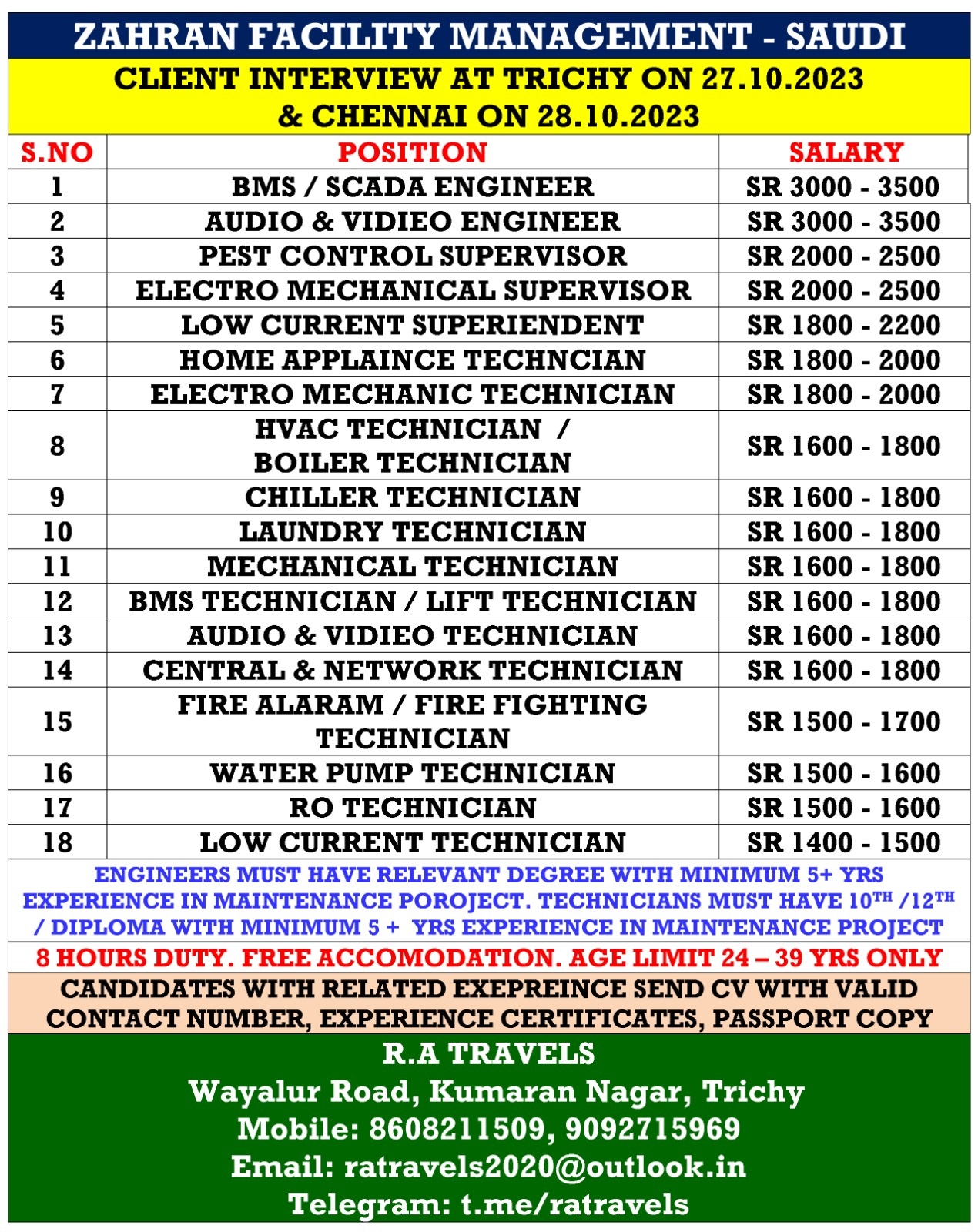 | Chiller Technician | 1800 SAR | |
