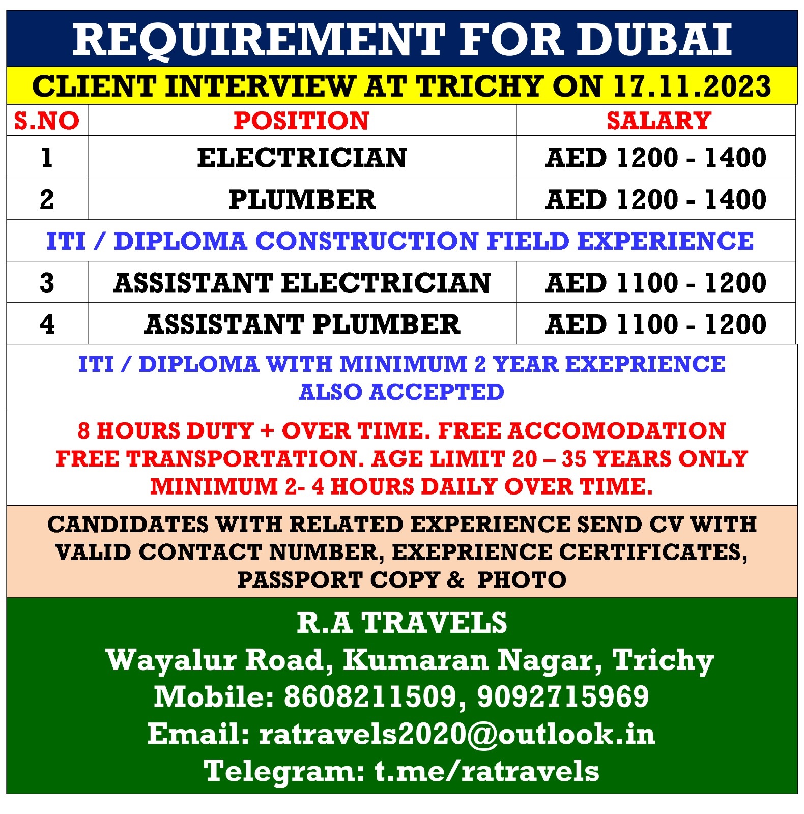 | Electrician | 1400 AED | |