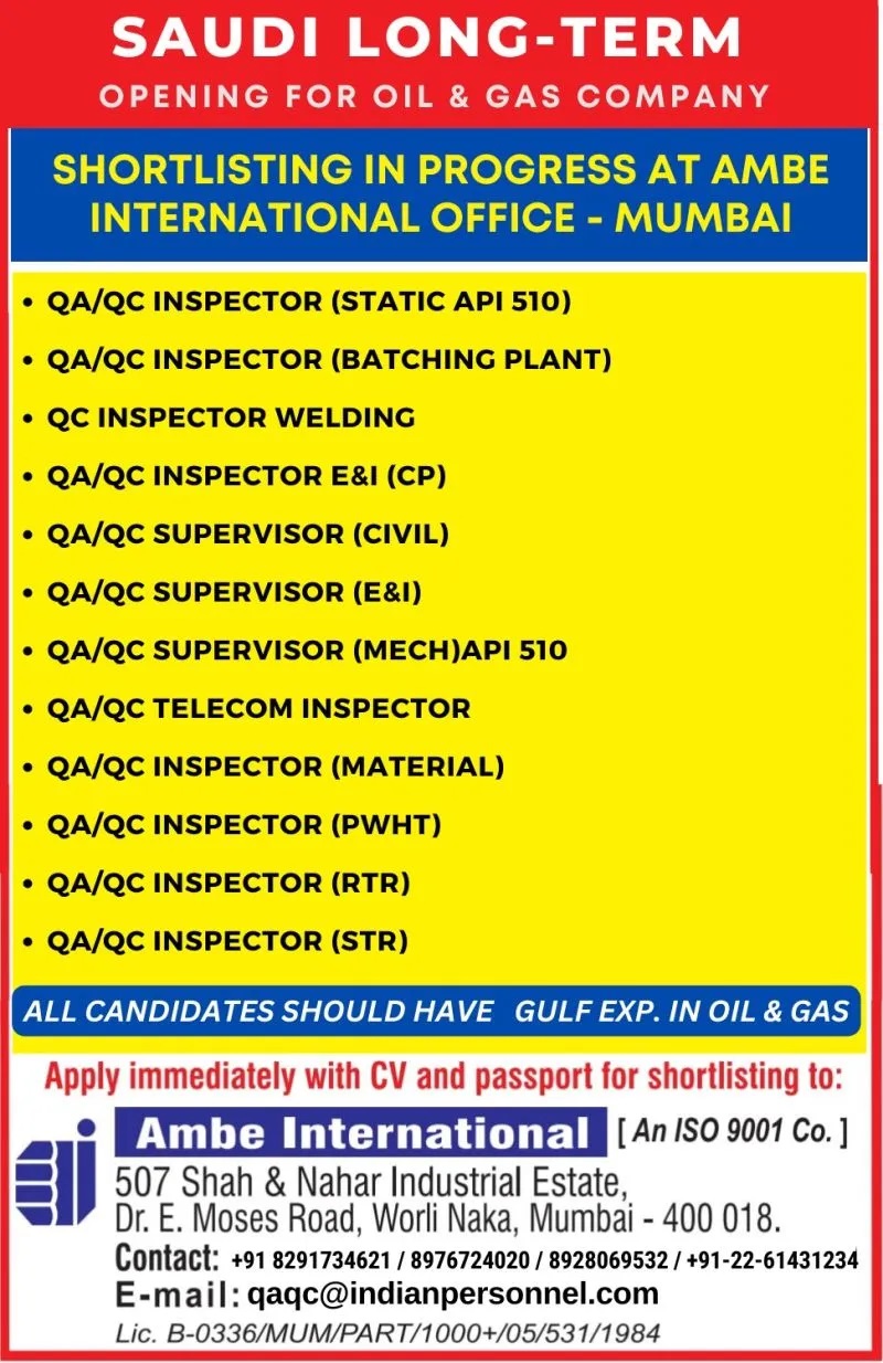Email : qaqc@indianpersonnel.com / Contacts : 8291734621, 8976724020, 8928069532, 22 61431234