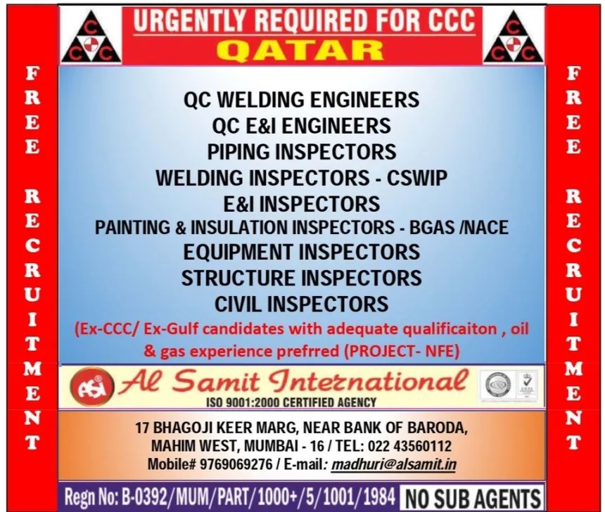 Ex-CCC / Ex-Gulf Candidates with adequate qualifiction, Oil & Gas experience preferred.