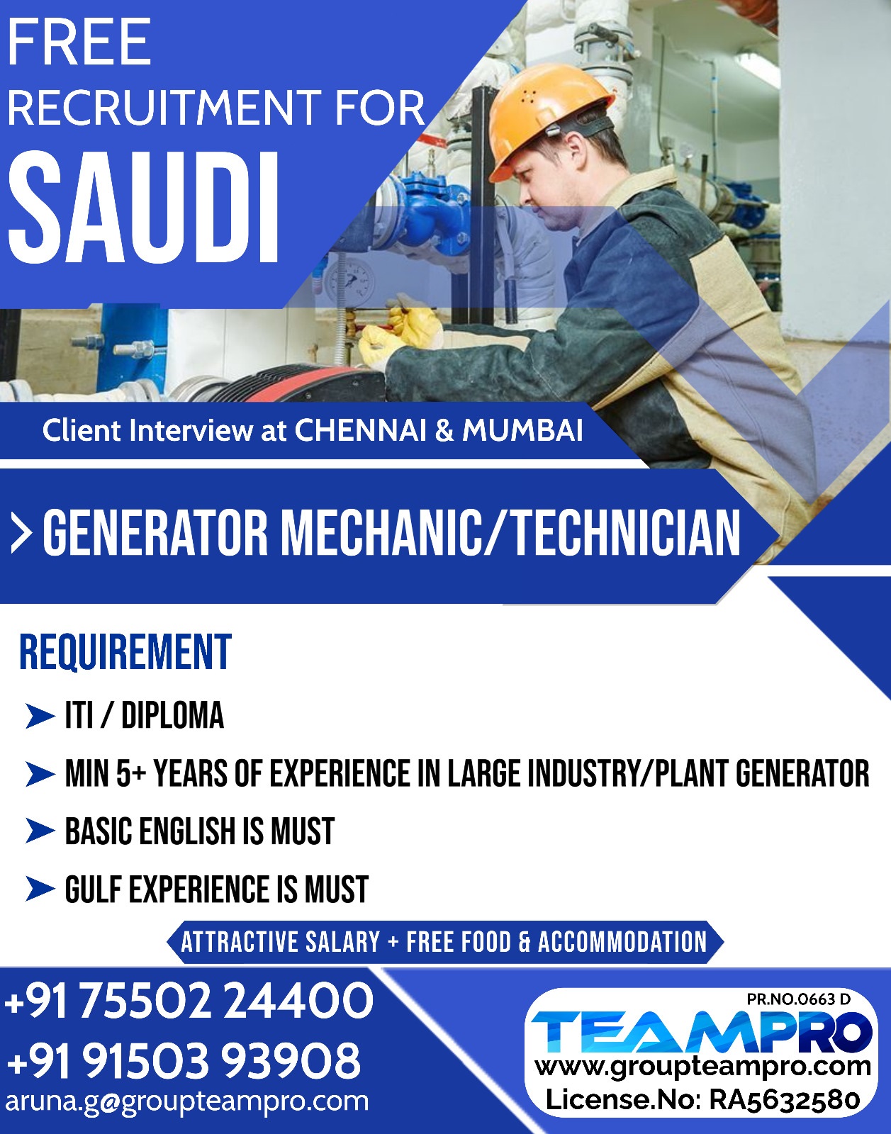 ITI / Diploma, Minimum 5+ Years of experience in large Industry / Plant Generator. Basic English is must, Gulf Experience is must.