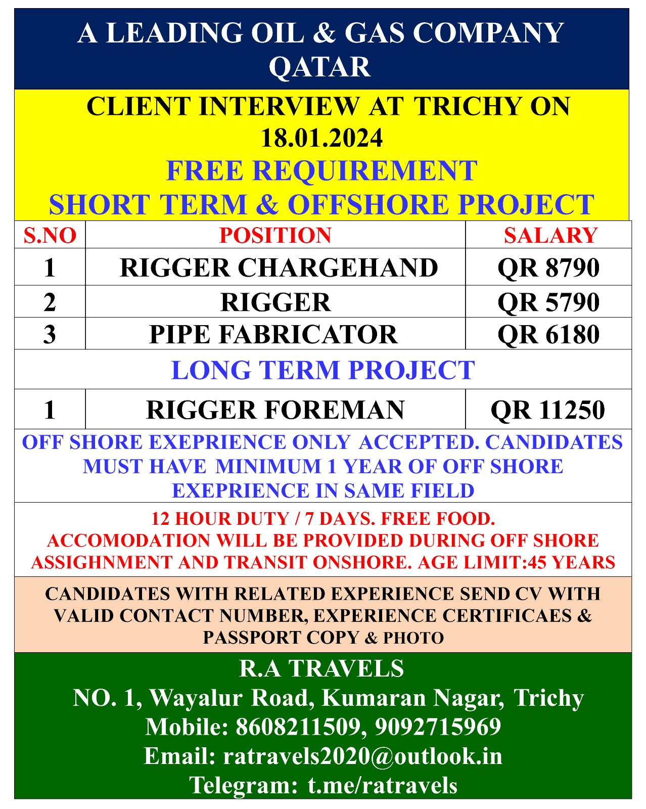 Oil & Gas Offshore Project - Free recruitment to Qatar