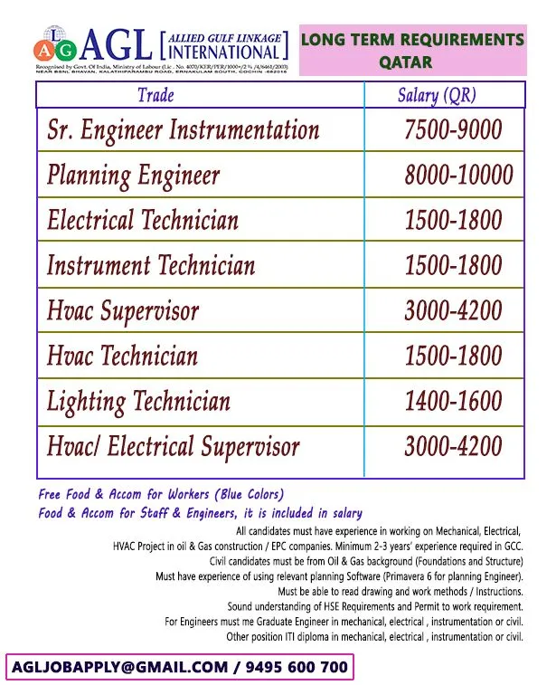 | HVAC/Electrical Supervisor | 4200 QAR |