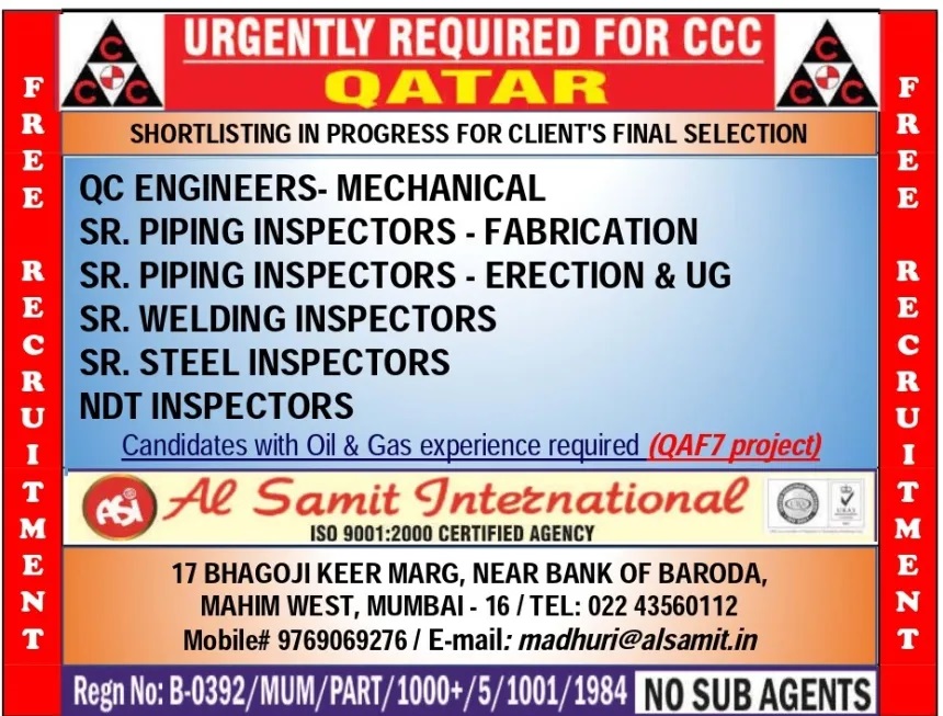 Disclaimer:- GCCWALKINS have no involvement in any recruitment process, This website just sharing job vacancies & interviews from various sources. Applicants are advised to research the bonafides of the prospective employer independently. We do NOT endorse any requests for money payments and strictly advice against sharing personal or bank related information. If you suspect any fraud or malpractice, email us at gccwalkins@gmail.com