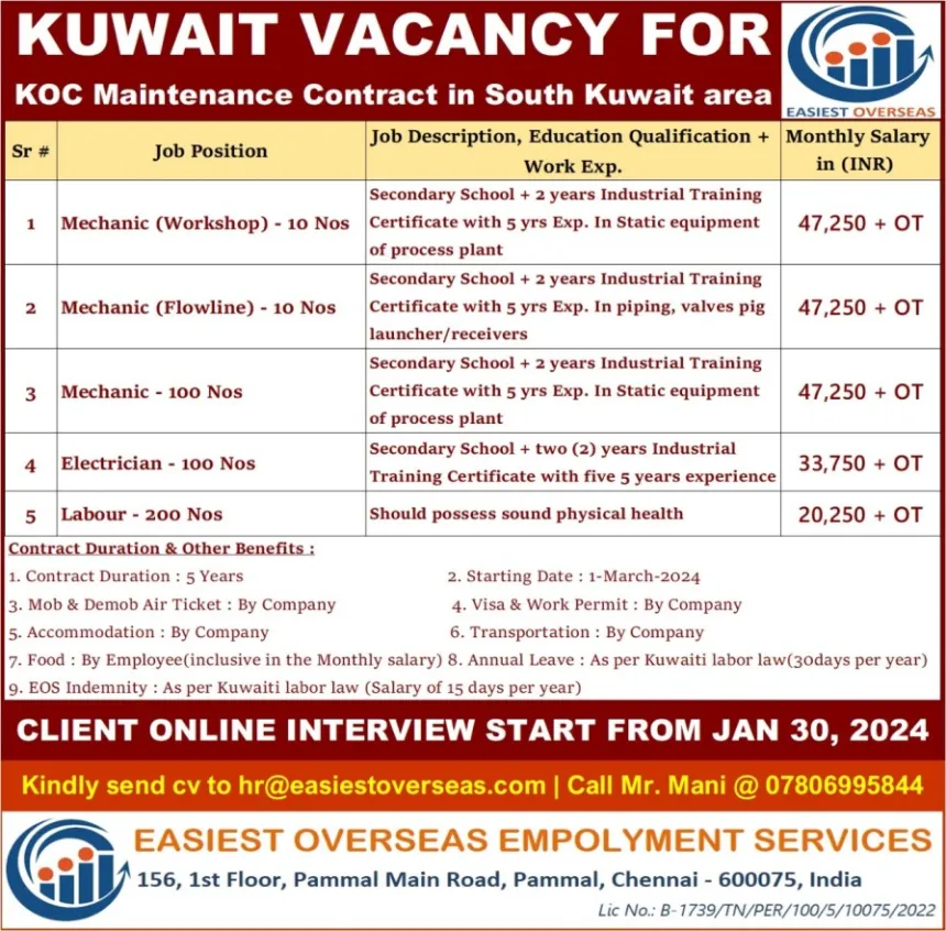Email : hr@easiestoverseas.com / Contacts : Mr. Mani 7806995844