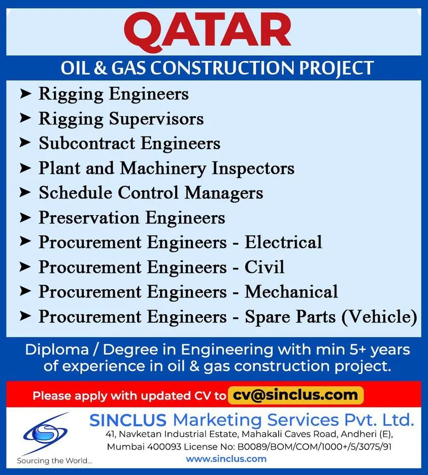 Diploma / Degree in Engineering with Min 5+ years of experience in Oil & Gas Construction Projects.