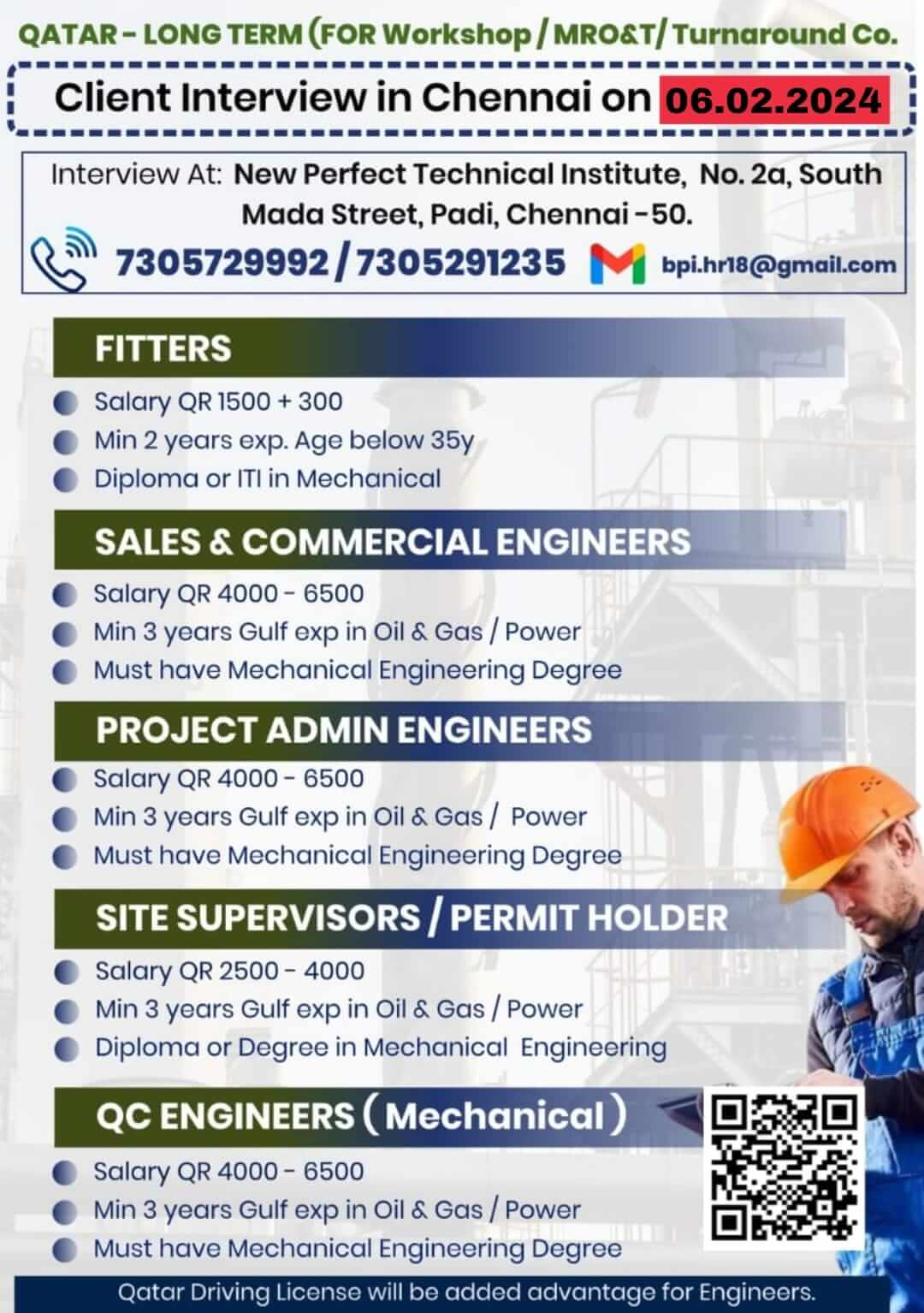 Minimum 2 to 3 years Gulf experience in Oil & Gas / Power and must have Mechanical Engineering Degree. Qatar Driving License will be added advantage for Engineers.