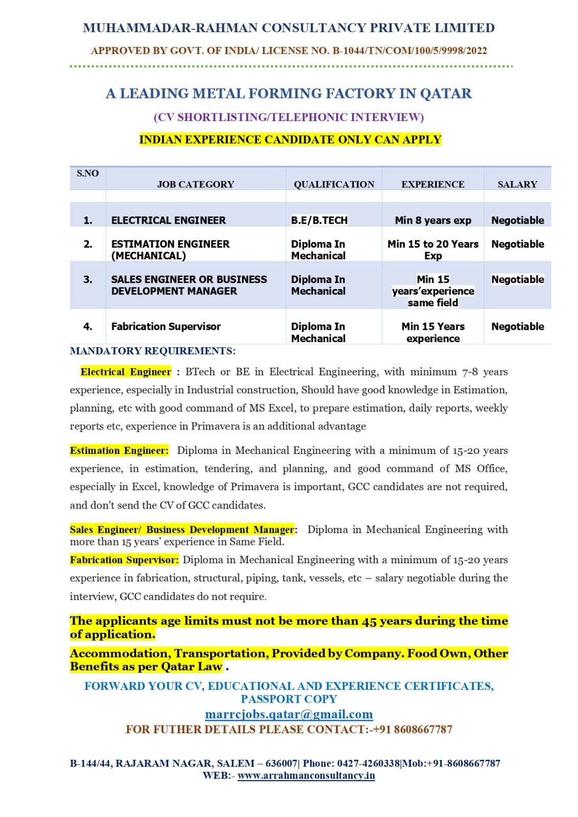 Email : maarcjobs.qatar@gmail.com / Contacts : 8608667787
