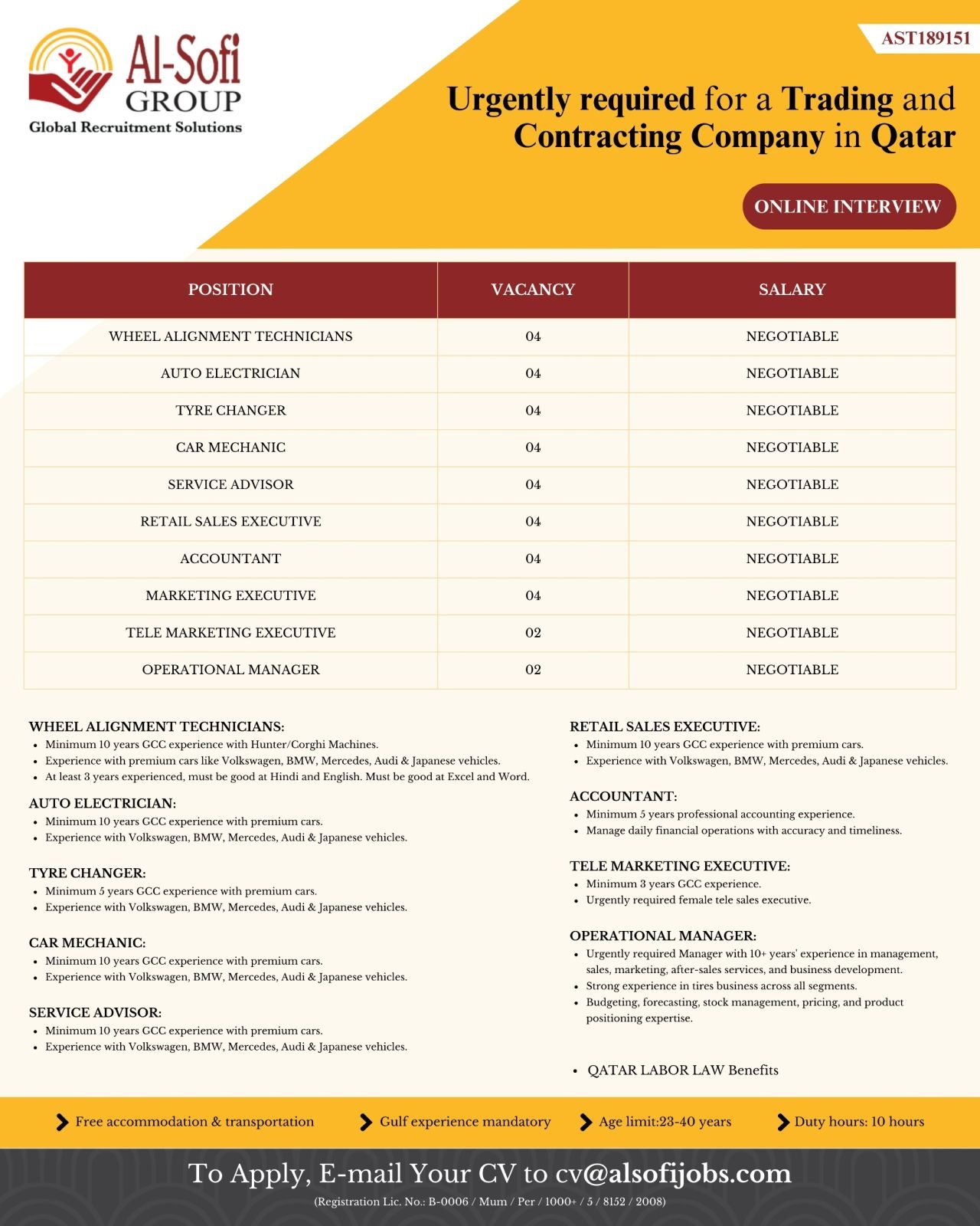 Above all Candidates Qualifed in respective discipline and having relevant experience in similar industry need to apply. Gulf experience mandatory, Age Limit 23 to 40 years.