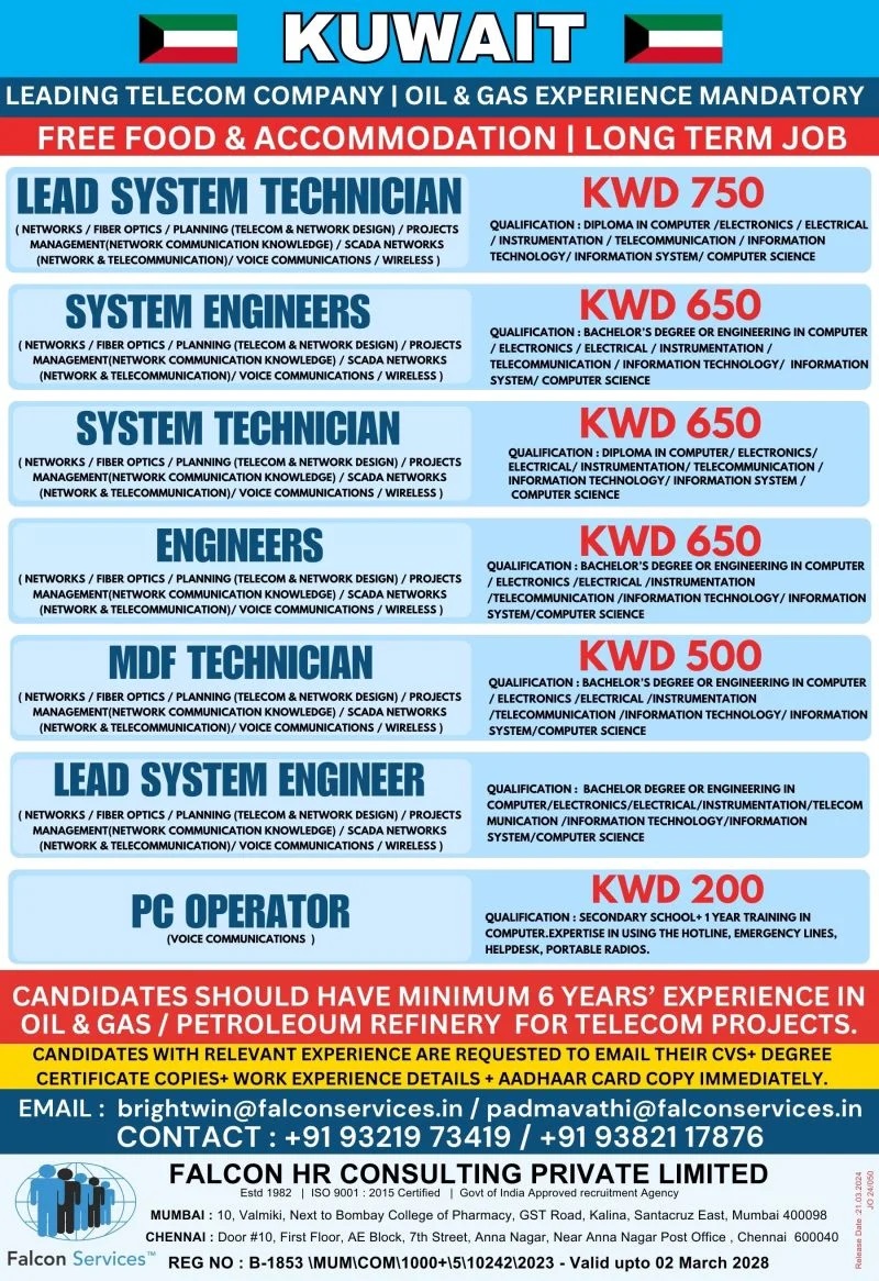Candidates should have minimum 6 years experience in Oil & Gas / Petroleum Refinery for Telecom Projects