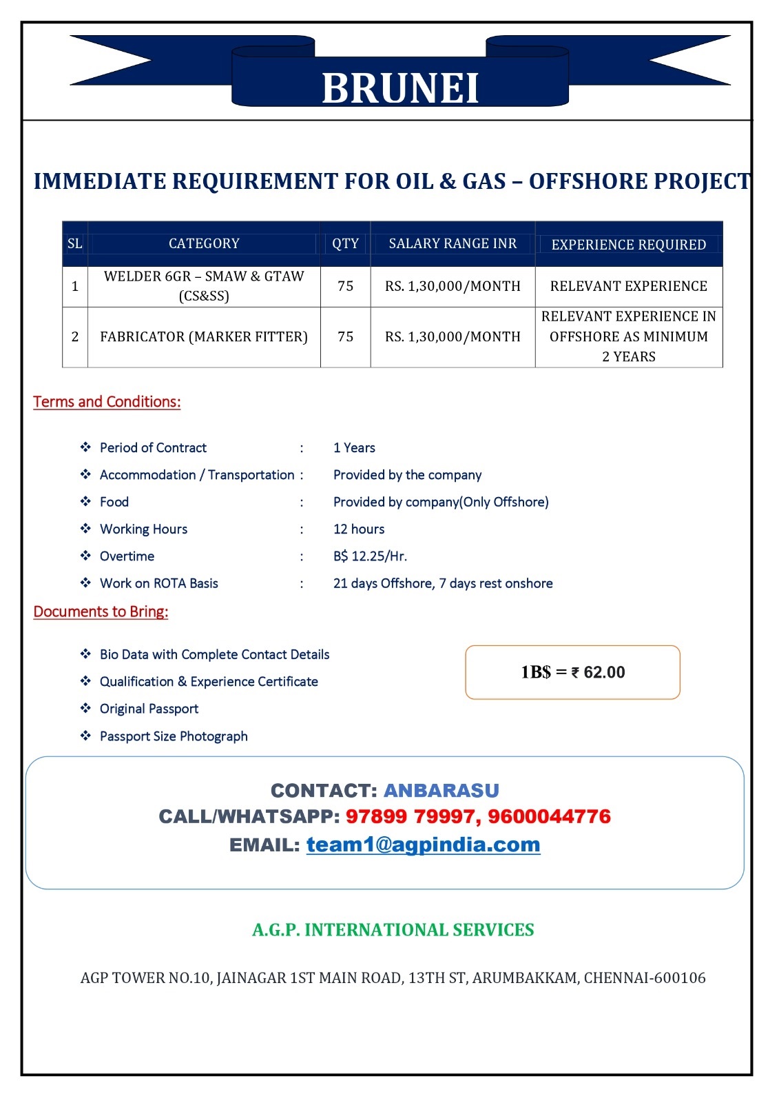 12 Hours duty + OT + Food (Only Offshore) + Accommodation + Provided by Company.