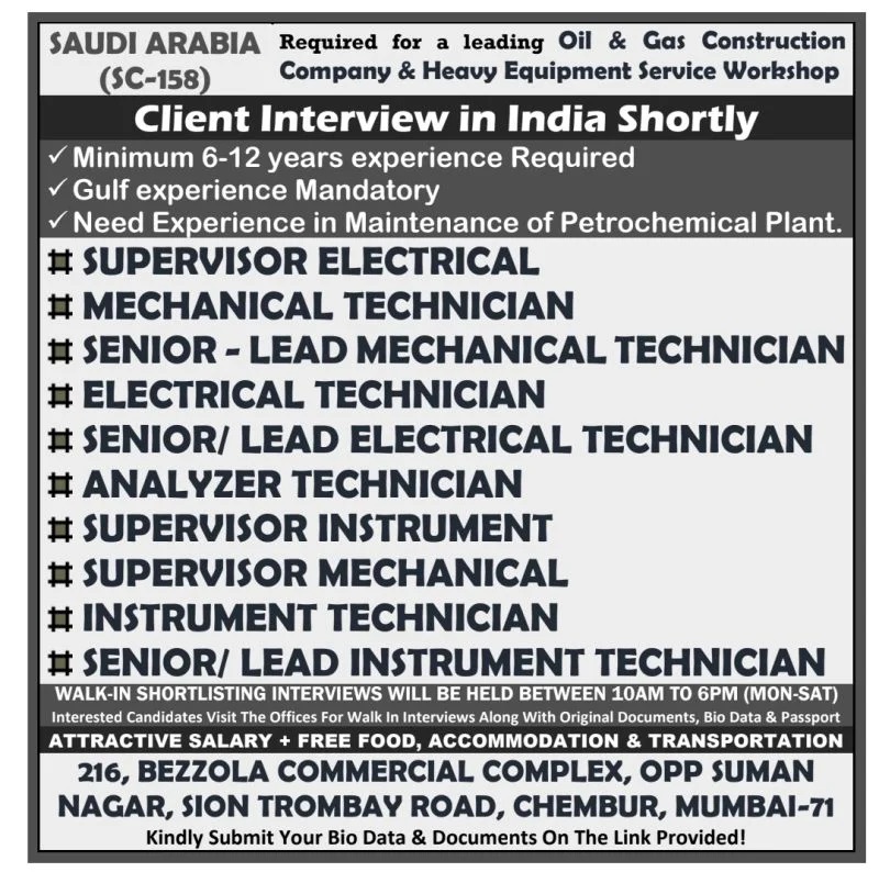 Minimu 6 to 12 years experience required. Gulf Experience Mandatory, Need experience in Maintenance of Petrochemical Plant.