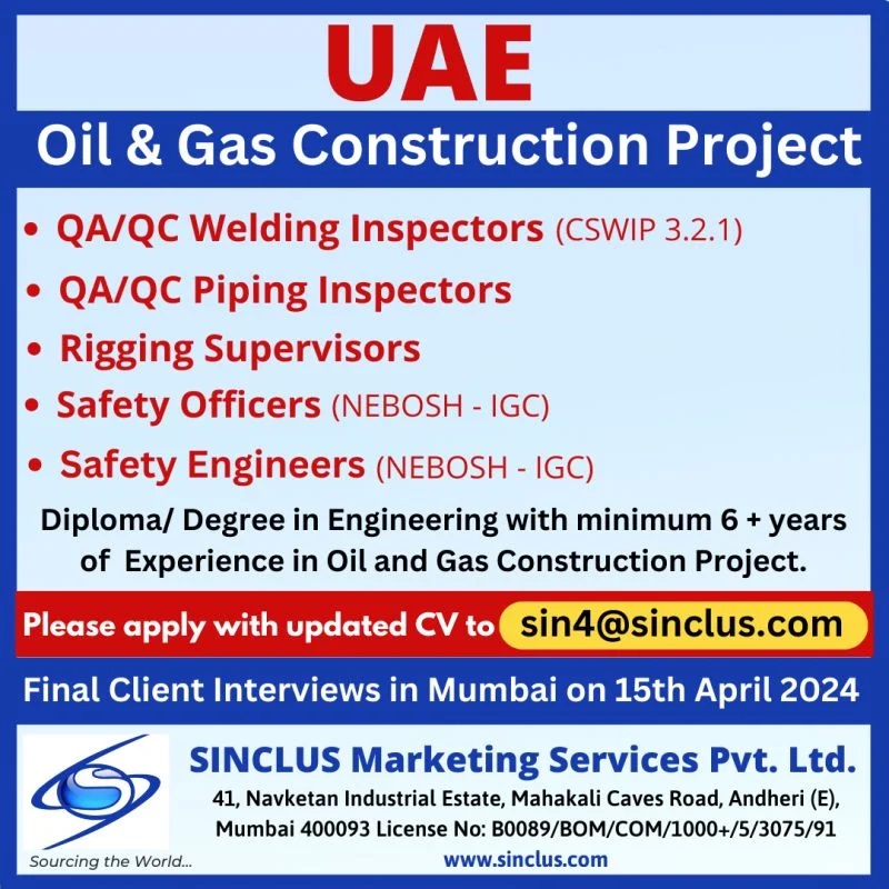 Diploma / Degree in Engneering with minimum 6+ years of experience in Oil & Gas Construction Project.