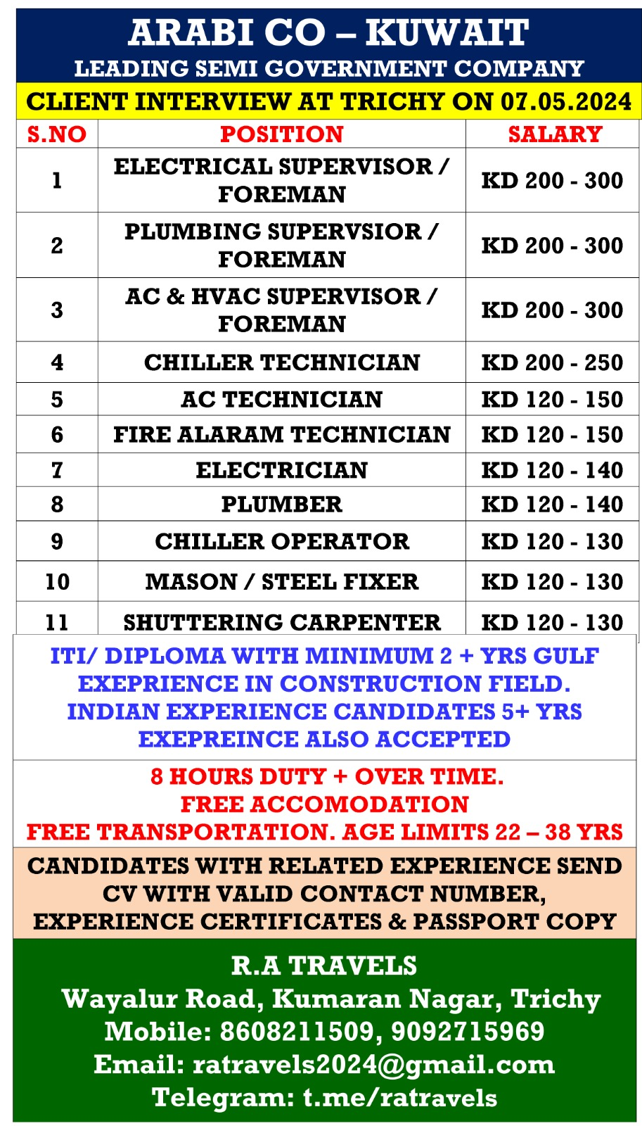 ITI / Diploma with Minimum 2+ years Gulf experience in Construction field. Indian experience candidates 5+ years experience also accepted. Age Limit 22 to 38 years.
