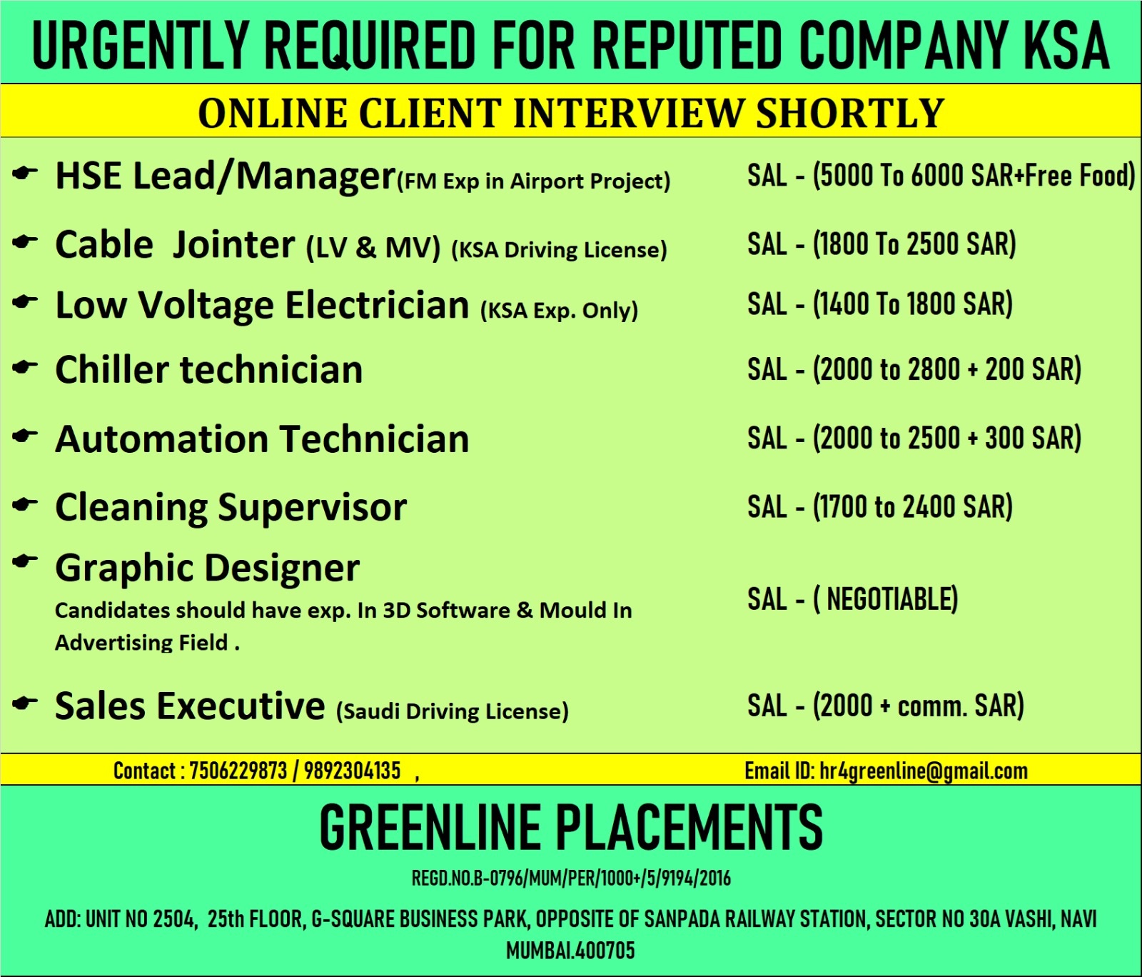 Email : hr4greenline@gmail.com / Contacts : 7506229873, 9892304135