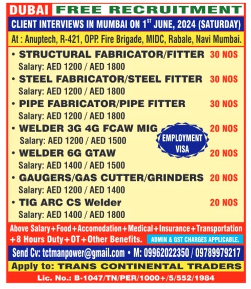 | Steel Fabricator/Steel Fitter | 30 | 1800 AED |