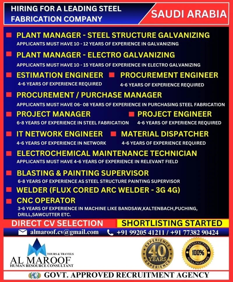 Steel Fabrication Company - Hiring for Saudi Arabia