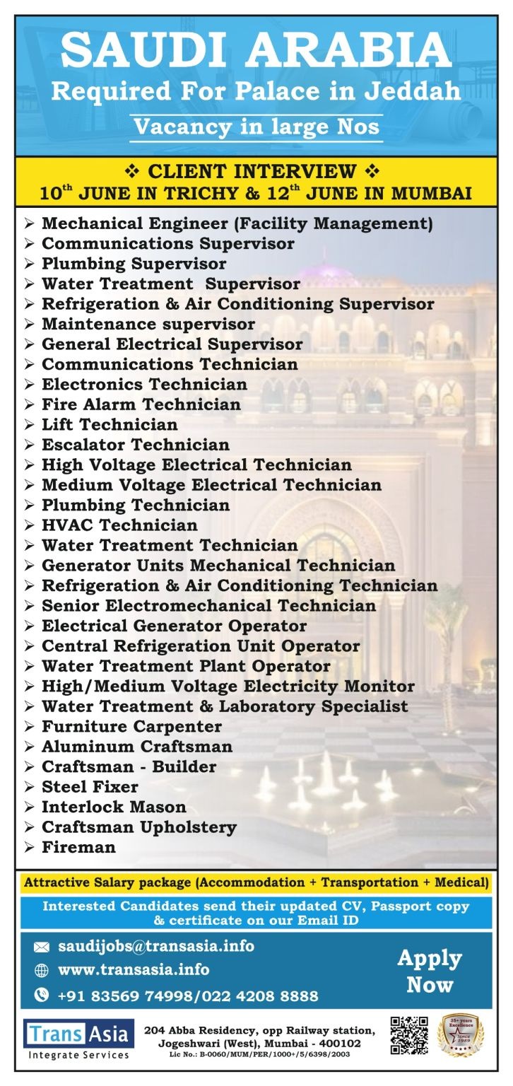 Email : saudijobs@transasia.info / Contacts : 8356974998, 022 4208 8888