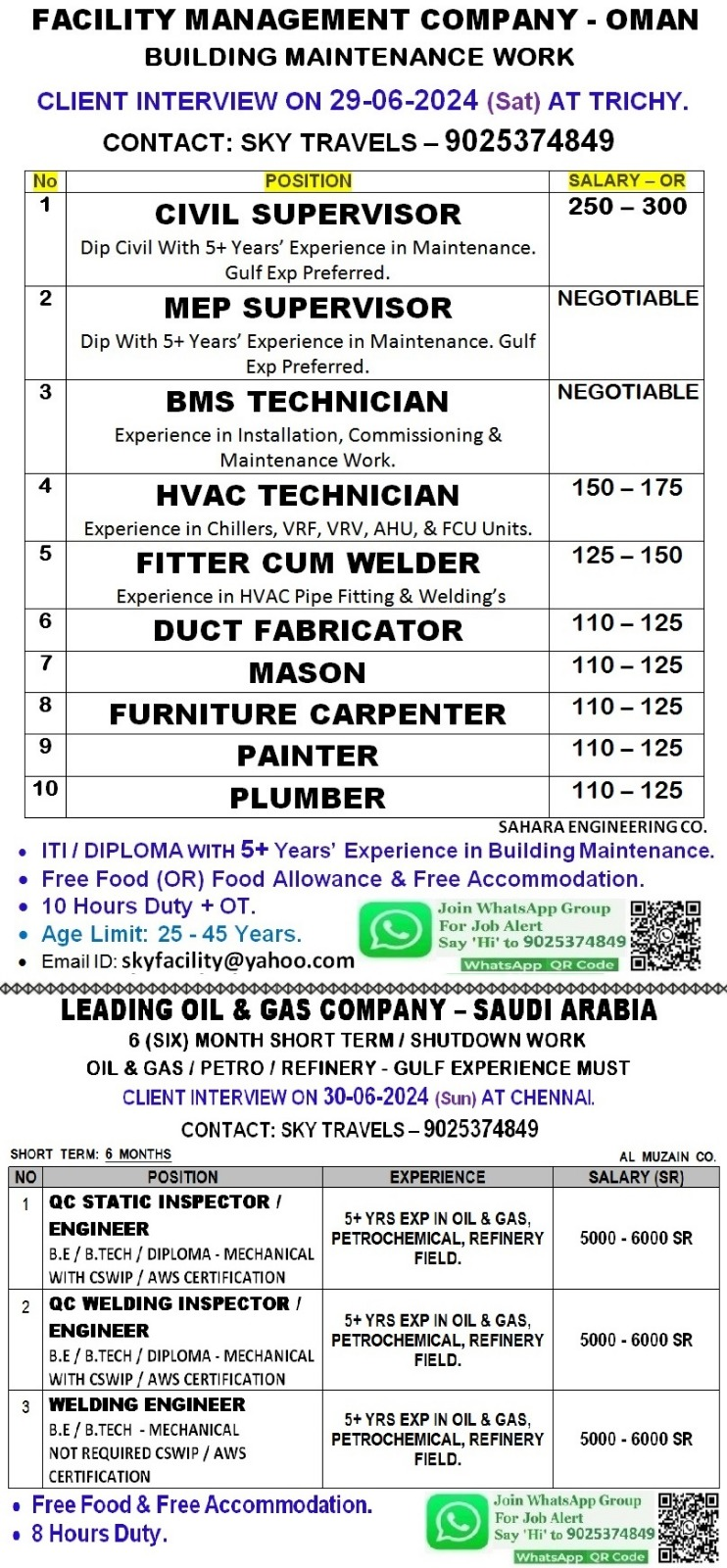 Oman Candidates should having ITI / Diploma with 5+ years experience in Building Maintenance.