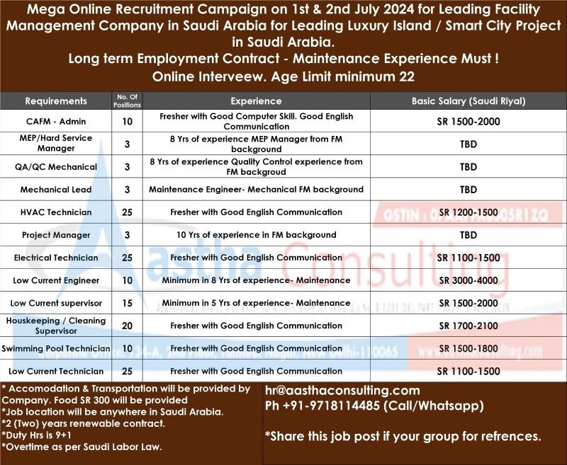 Email : hr@aasthaconsulting.com / Contacts : 9718114485
