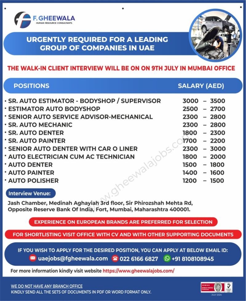 Email : uaejobs@fgheewala.com / Contacts : 022 61666827, 8108108945