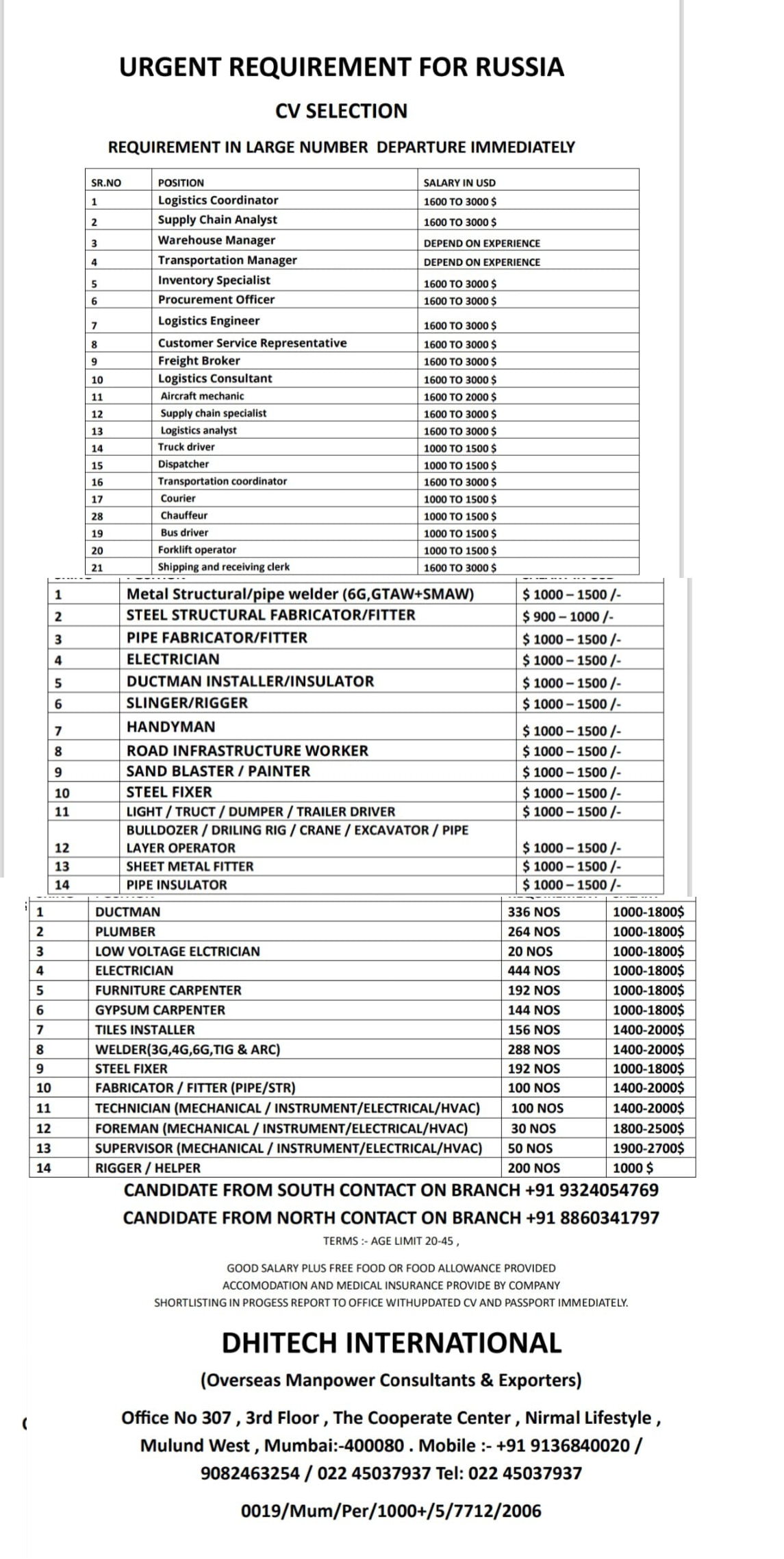 Technicians(Mechanical/Instrument/Electrical/HVAC) | ||