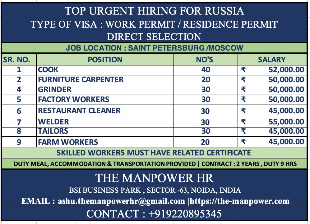 Urgent jobs in Russia for Indian - Saint Petersburg/Moscow